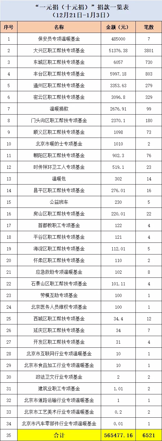 自2021年12月21日以来,截至2022年1月25日,“一元捐(十元捐)”活动已收到2.38万余名首都爱心职工捐款98.51万余元。